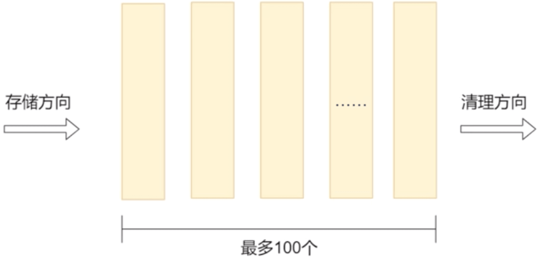 这是一种清空策略,它是先进先出;假如我们现在有100条数据,存储的方向是从一个链表的尾部插入,从一个链表的头部取出;假设我们是这样的一个算法。 当我们现有的数据小于100的时候,我们可以一直存入;当现有数据等于100的时候,我们每存入一个就需要取出一个,从头部存入,从尾部取出;这样就会产生一个结果, 我们最早存入的数据最早取出,这样就构成了先进先出。