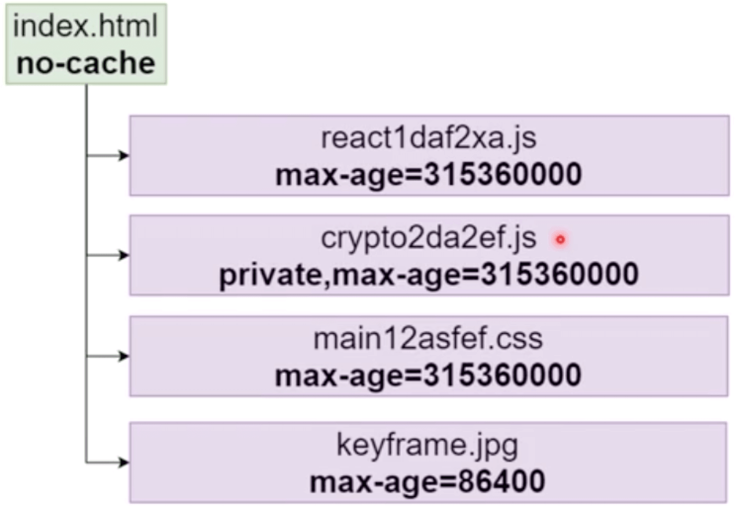 第一个文件:react、vue、jquery这些库我们会把期限设置成最大,原因是这种更新周期是非常慢的,如果要更新这个文件我们可以更改文件名的hash值,这样文件名变了又可以请求新的文件了。如果我们什么都不写,就是允许公有方,像cdn、代理服务器它们都可以缓存这个文件。