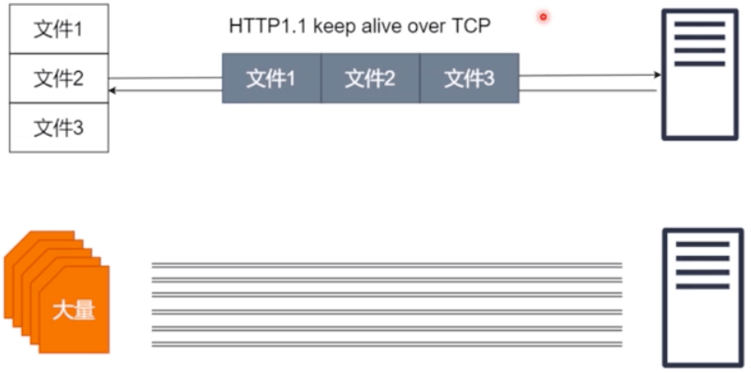 HTTP 1.1多个文件共用一个TCP,这样可以减少tcp握手,这样3个文件就不用握手9次了,不过这样请求文件需要排队,请求和返回都需要排队, 如果第一个文件响应慢,会阻塞后面的文件,这样就产生了对头的等待问题。