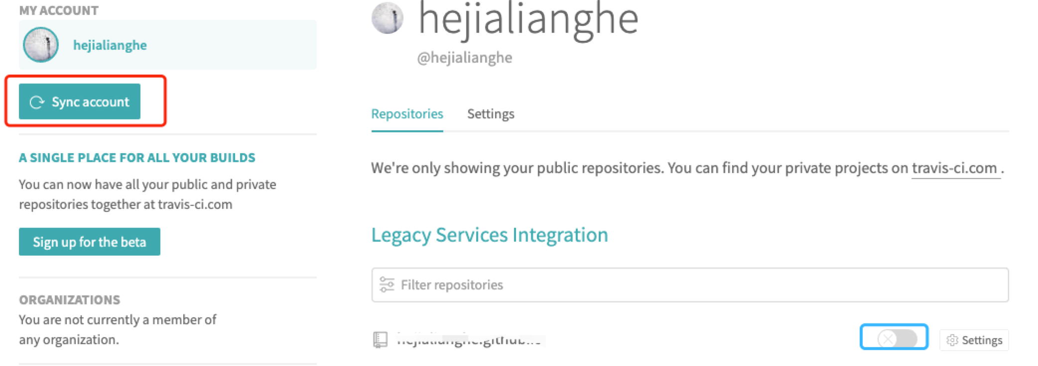 首先我们准备一个github账号,然后访问Travis Ci (opens new window);用github账号去登录;然后点红色标识的按钮更新仓库,点蓝色标识的部分触发某个项目进行构建。