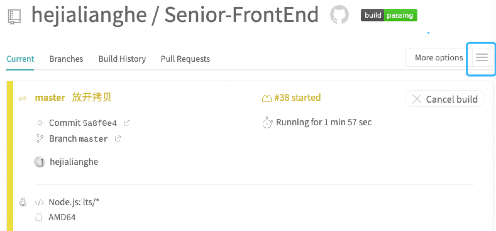 我们进入Travis网站,点进构建的项目中去,然后点击右上角蓝色部分->点击Settings
