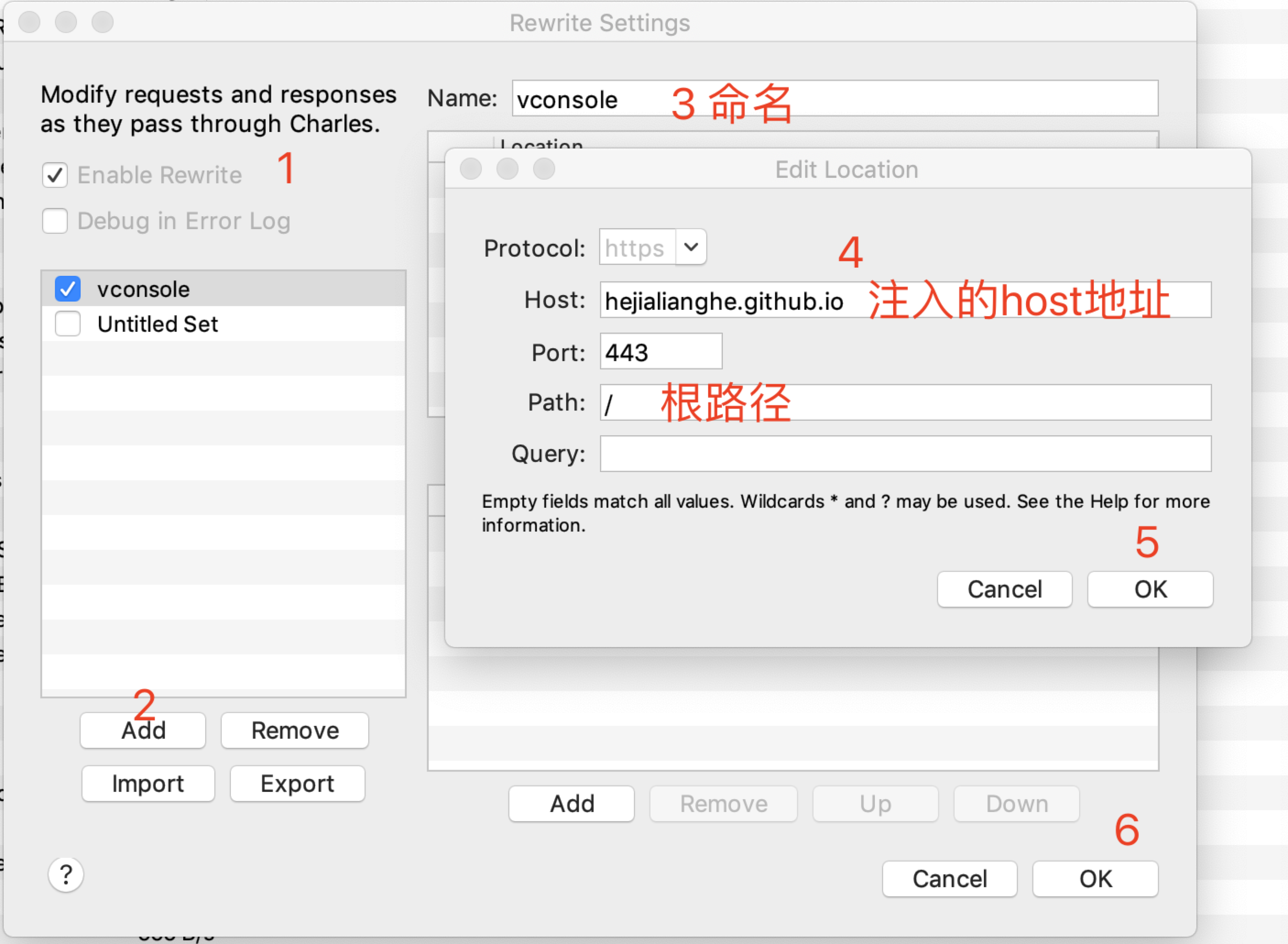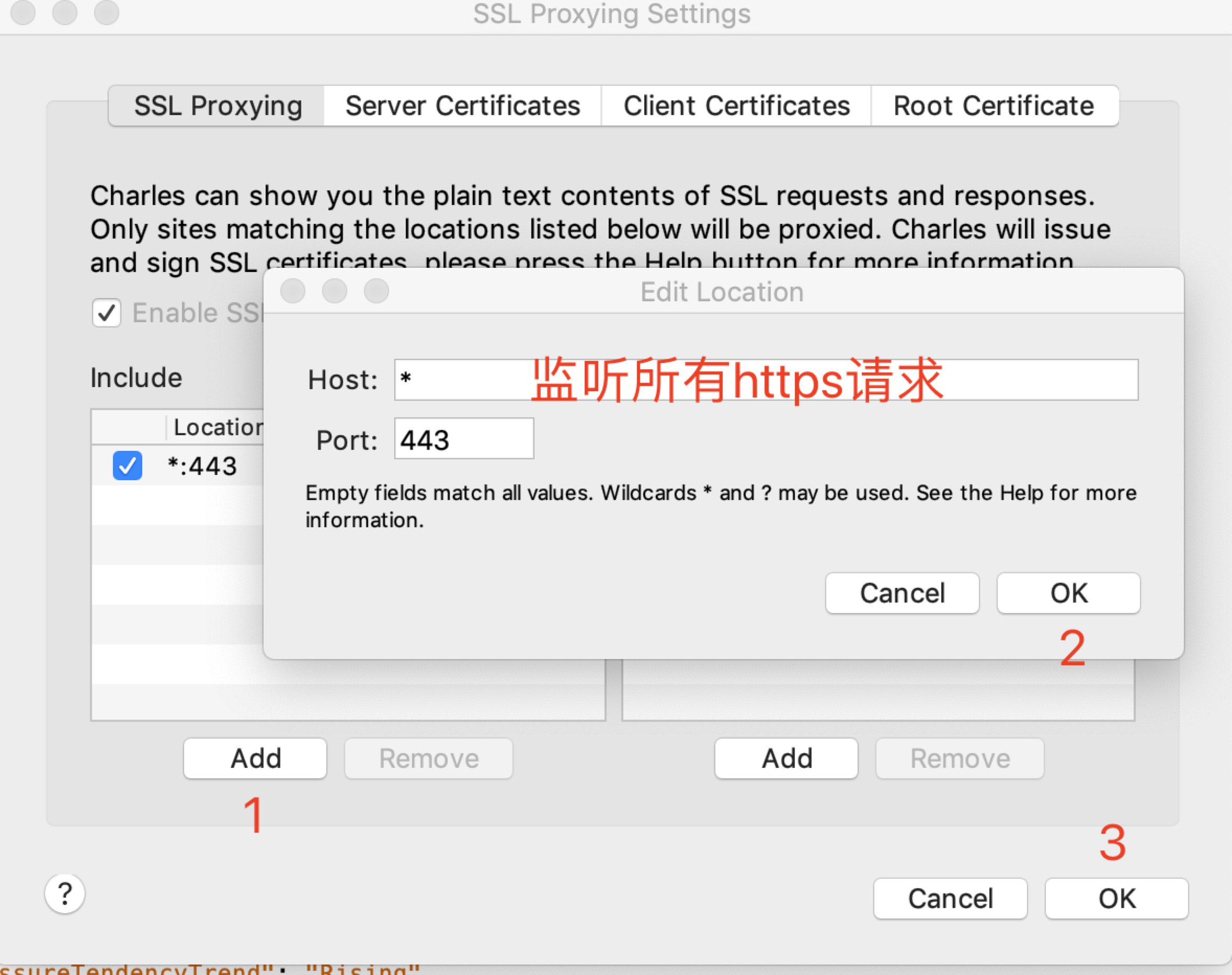 - 在Host一栏设置要解析的域名,也可以*表示所有的HTTPS都做解析,port:443;点击ok后重启charles。