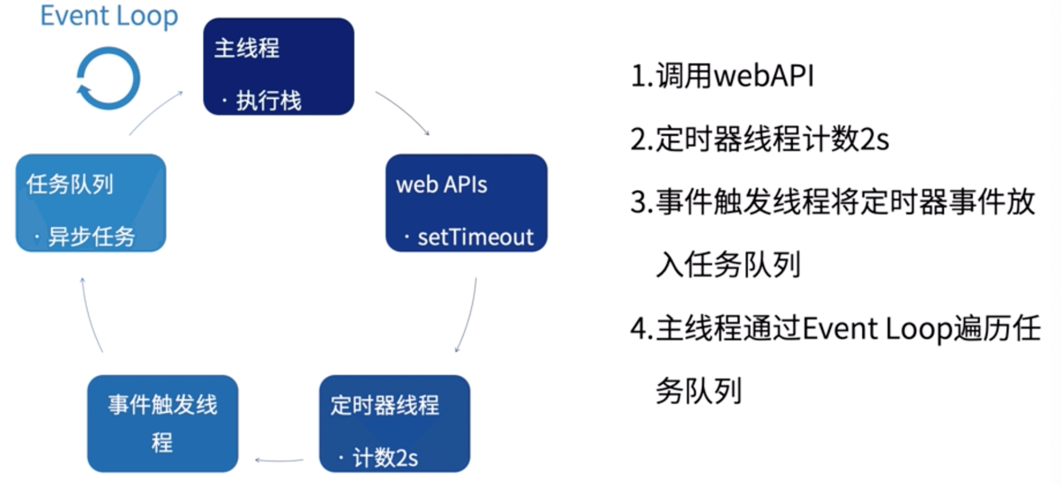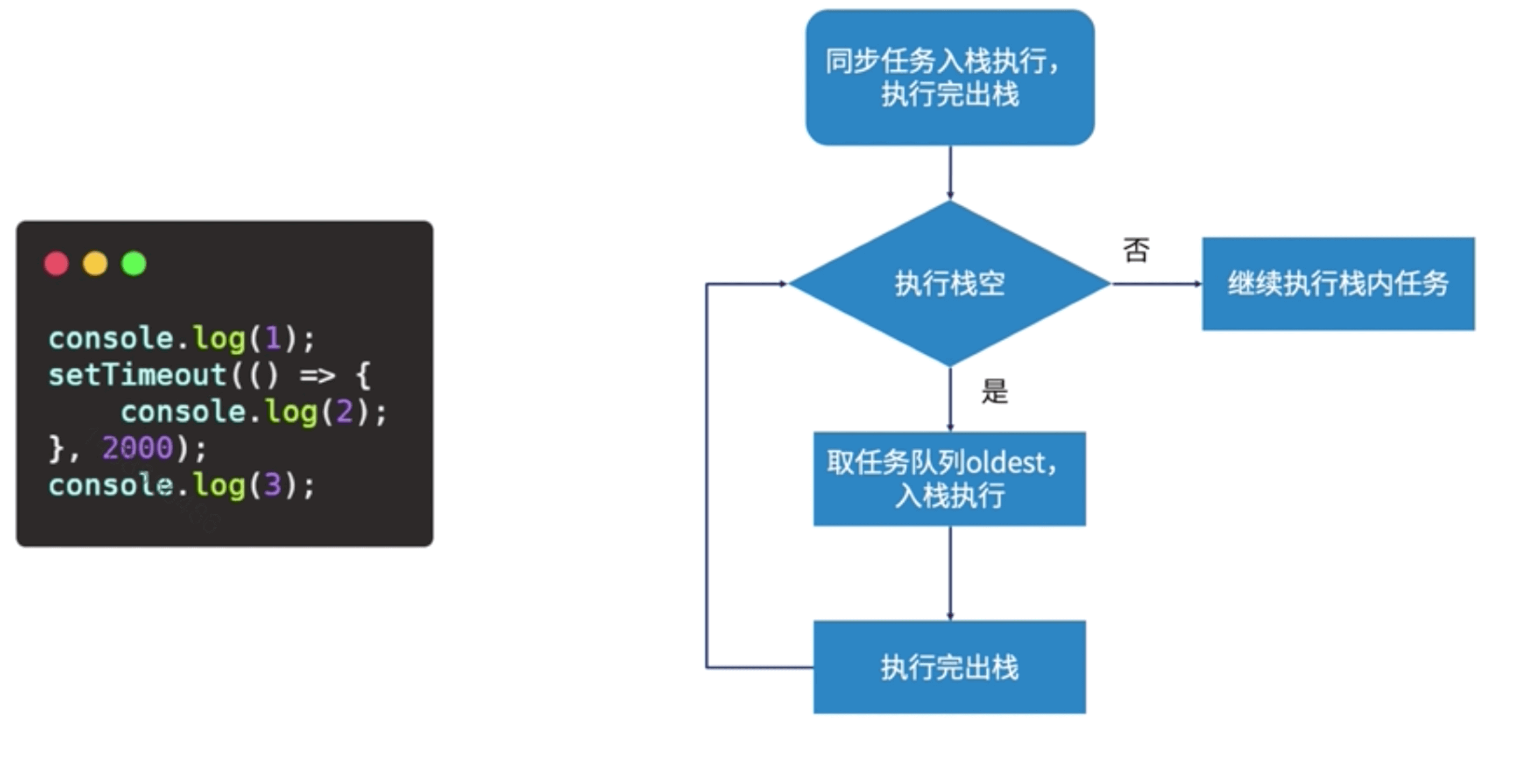 setTimeout调用 setTimeout 这个 webapi,通知定时触发线程定时 2 秒钟 console.log(3)入栈执行,执行完出栈- 栈中已经空了,去检查任务队列,此时还为到 2 秒钟,任务队列中还没有任务;这是一个循环检查的过程,等到 2 秒钟后 事件触发线程往任务队列中添加了定时器的事件,这时候再去检查的时候已经有了定时器的异步任务,我们取出这个任务放到执行栈中执行,这时候打印出了 2