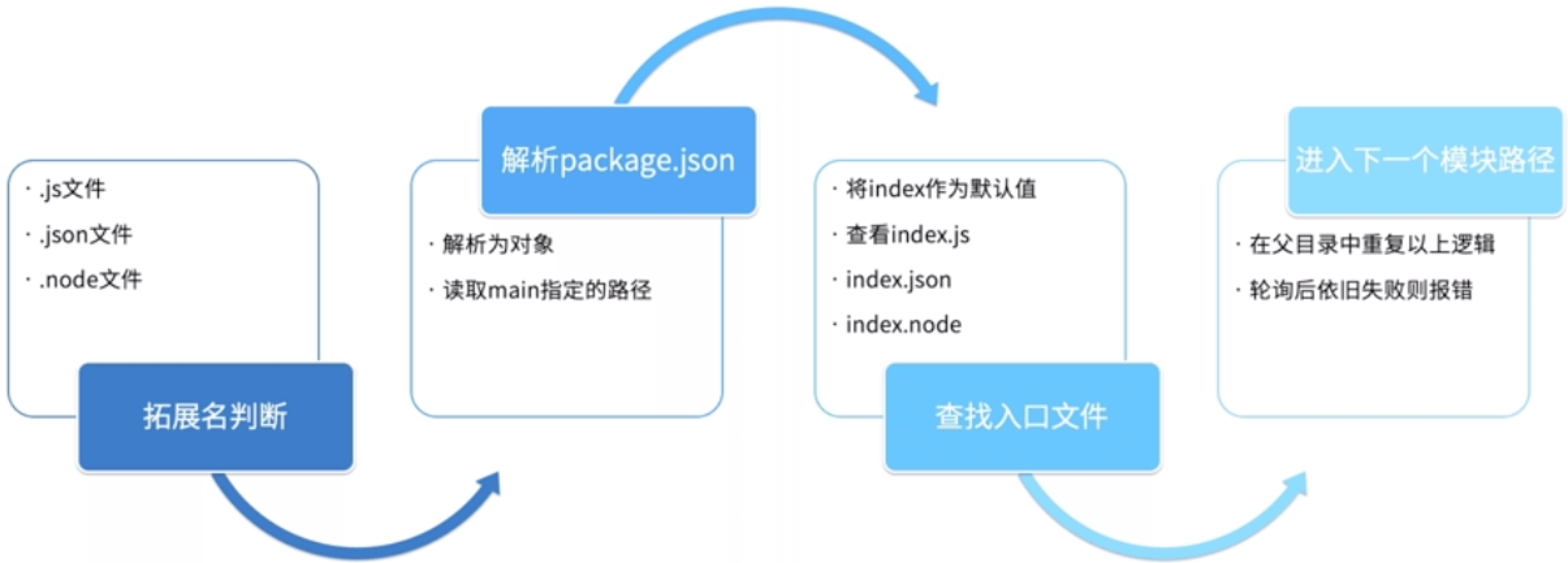 - 如果是相对路径或者绝对路径,node会先把相对路径转换成绝对路径,会在当前路径下查找是否有xx文件,如果存在就返回,如果没找到会把xx当作目录,在这个目录下查找index文件,找到就返回,没找到就Can't find。