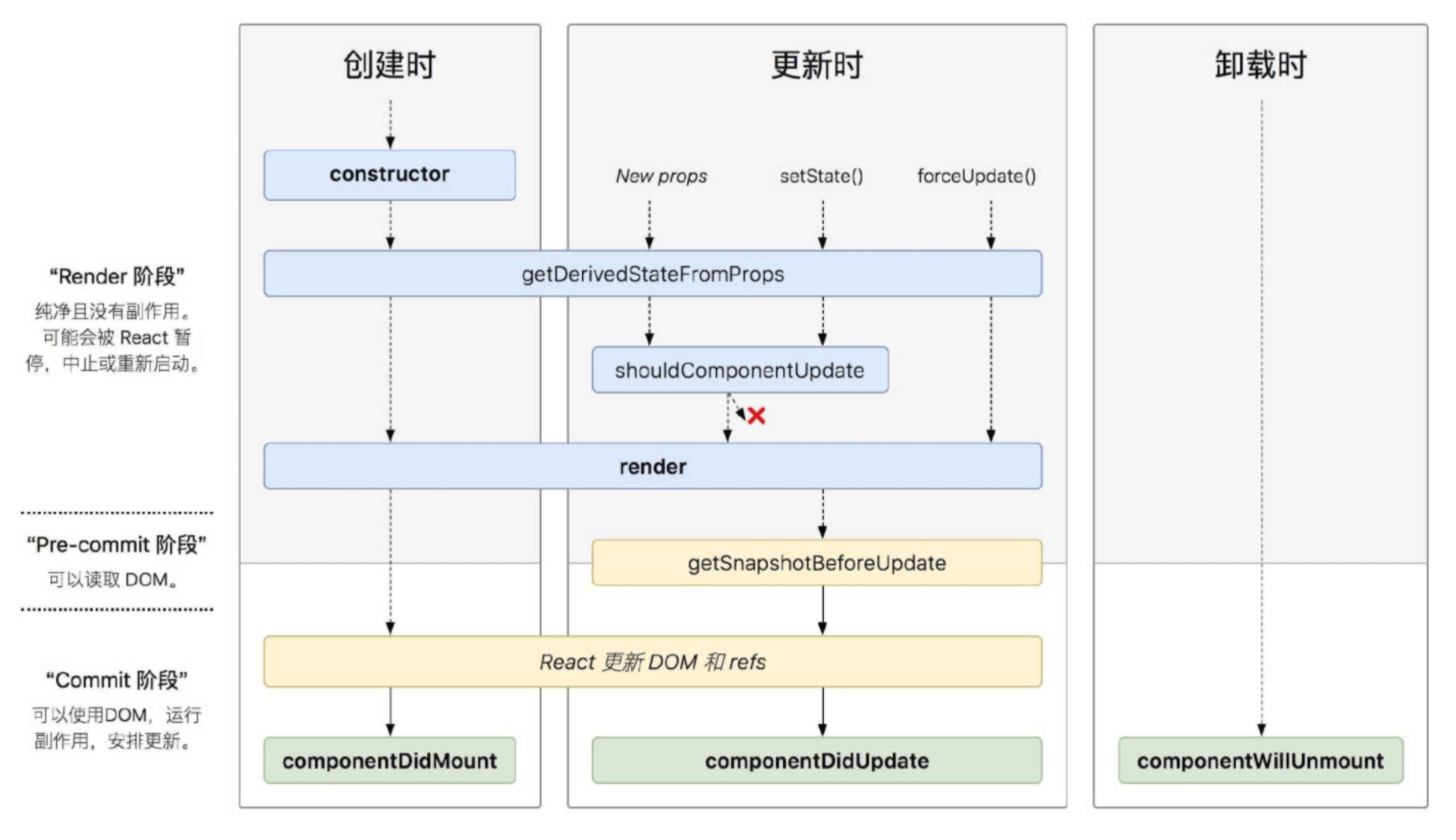- getSnapshotBeforeUpdate 生命周期方法在更新之前(如:更新 DOM 之前)被调用。此生命周期的返回值将作为第三个参数传递给 componentDidUpdate。(通常不需要,但在重新渲染过程中手动保留滚动位置等情况下非常有用。)
