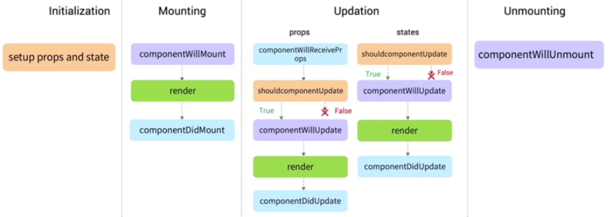 - componentWillUnmount 卸载函数,组件卸载及销毁之前直接调用,主要用于清除一些在组件生命周期订阅,真实DOM事件以及setTimeout/setinterval的返回值
